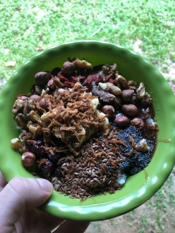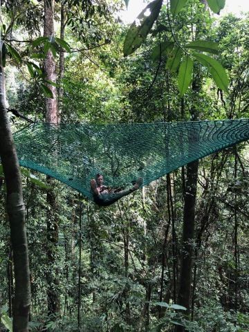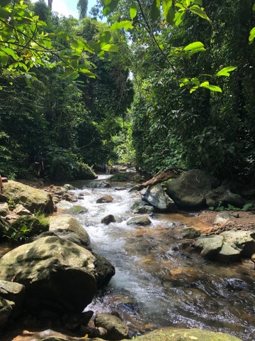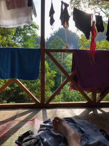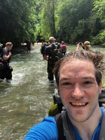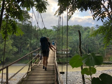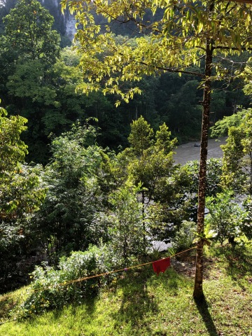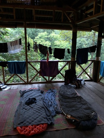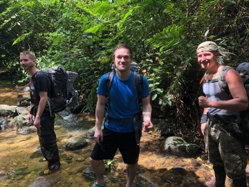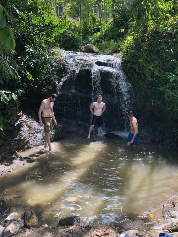 Snídaně. Jako vždy rýžová kaše na sladko a do ní si sypeme různé ingredience. Goji, mák, kakao, rozinky, oříšky, palmový cukr (neplést s palmovým olejem) a na vrch čerstvý ananas. Spojil jsem příjemné s užitečným a vzal nádobí umýt při ranní koupačce. Čvachtám se v řece, když tu najednou rána praskajícího dřeva. Špeh prozrazen. Opičák neodhadl sílu větve a ta pod ním rupnula. Zvládl tak tak přeskočit na jinou, nádledoval dlouhatánský skok nade mnou z jednoho břehu na druhý, a pak už jsem jen pozoroval jak si to skáče dále do džungle. Krásné a chytré zvíře.