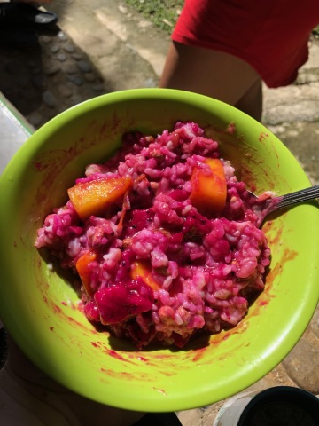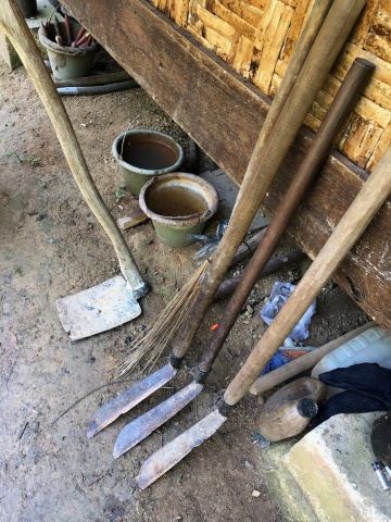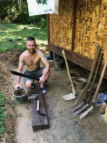Dopoledne trávíme prací. Jeden po druhým fasujeme podivné nástroje a dostáváme instrukce, k čemu se používají. Já měl prvně místní verzi kosy, která se drží v ruce, krouží se ramenem a voalaaa, seče to. Poté si přebírám jakýsi zakulacený rýč a mám novou funkci “vydlabávač schodů”. 3 hodiny potu a dřiny, máme odmakáno. S radostí s debatami se vracíme na oběd - rýže, kokosová omáčka s kurkumou a dýní. Jaké já mám štěstí na kuchaře a kuchařky!