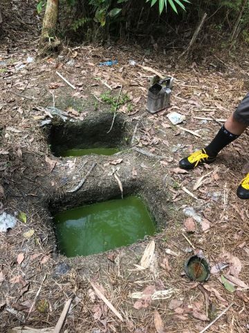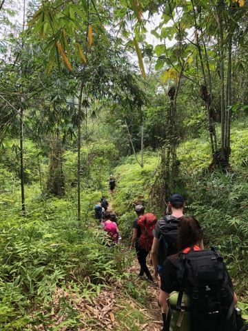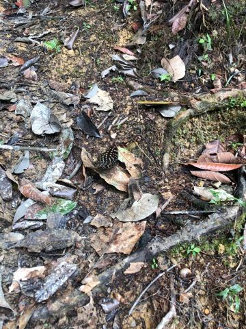 Přecházíme na oběd do druhého tábora, tentokrát dobrodružnější cestou po vrstevnici při hranici s národním parkem. Cesta skrze uklouzanou pěšinku širokou tak akorát na krok. Nebýt kořenů stromů, člověk by často sjel až do potoka po stráni. Začalo pršet překvapivě brzy (běžně v deštném lese prší přes noc). Přebíráme si zásoby na vaření a vyrážíme zpět do tábora. Za bouřky. Cesta utekla o dost rychleji. Hromy a blesky všude kolem. Dorazili jsme v pořádku. Večeříme, popíjíme čaj a povídáme. Zítra nás čeká pracovní den.
