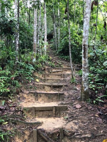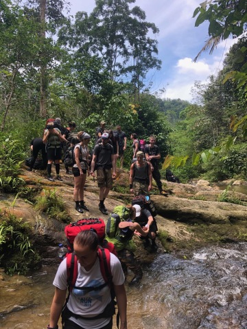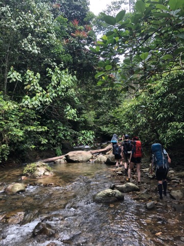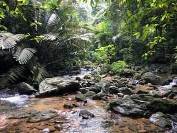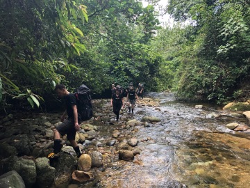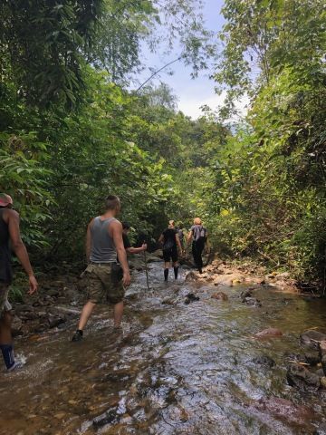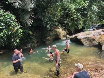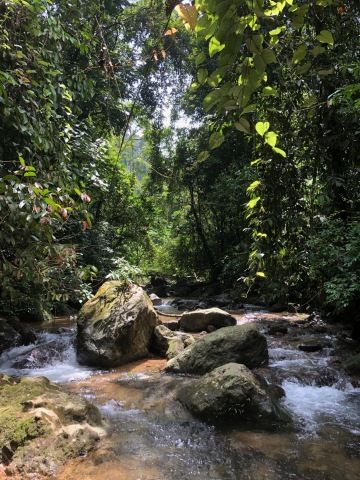 Snidame rýžovou kaši s kakaem, mákem a... kdo si co nasype. V poledne se loučíme s osazenstvem a vyrážíme na prohlídku rezervace. Na začátku trasy procházíme kaučukovou plantáží, která se postupně mění v původní porost. Chvíli jdeme pralesem, ale většinu cesty se brodíme potokem, který krásně ochlazuje. Dvakrát zastavujeme na koupačku v tůňkách a počítáme, kdo má kolik pijavic. Krásné místo. Nejde popsat ten pocit, když se rochníte v čistém potoce, sledujete hustý vysoký porost a posloucháte orchestr tisíce živočichů kolem vás. Tady si uvědomíte, odkud člověk pochází. Co je pro něj opravdu přirozené.