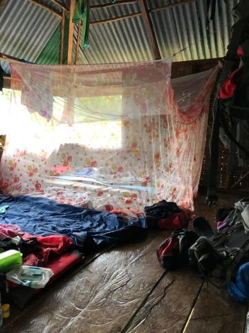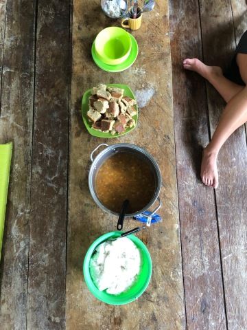 Tomáš, jeden z dobrovolníků, mě bere na síť. Skryté místo na jednom z okolních kopců, které poskytuje odpočine a šanci vidět opičáky, pokud je člověk potichu a v klidu. Nevýhodou je pak spousta dotěrných komárů. Odpolední klid a čekání na bouřku. Ta nepřichází. Hurá, večeře. Pikantní směs čočky, fazolí s rýží a chlebovými placičkami pomazanými česnekovým dipem. Skvělý. Uvidíme, jaká bude noc. 🙂