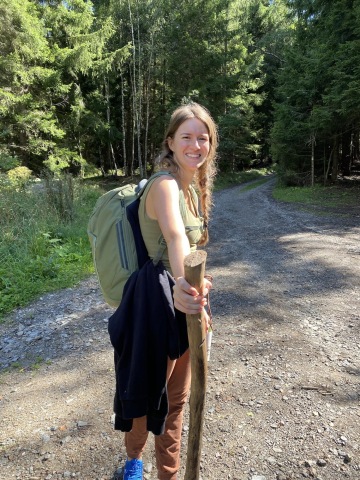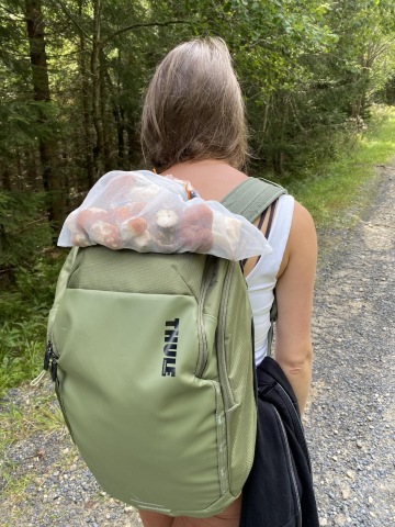 “Hele houba!” Slyším od Janči. Našla nádherného křemeňáka. Tím se na pár desítek minut měníme z turistů na houbaře a pár kousků na polévku si odnášíme. Zbytek necháváme přírodě. Pauza na odpočinkovém místě, povídáme si se starším párem o elektrokolech a odnášíme si fajn tipy. To jsme ještě nevěděli, že nás putování pěšky, přivede k jinému pohledu na věc. Jdeme několik kilometrů pěšinou, kde je na začástku i na konci cedule "zákaz kol" kvůli klidovému území. Těšíme se na klidnou cestu, ale 15 (asi krátkozrakých) cyklistů, z toho několik uřvaných důchodců, nám to kazí.
