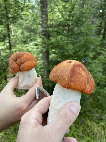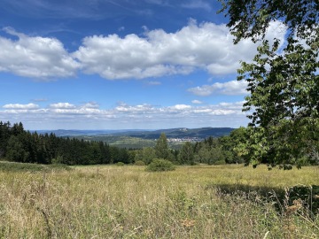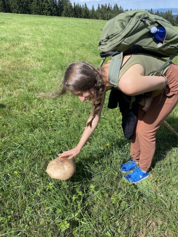 Ocitáme se na krásné louce, fotíme velikánské bedle, které se usídlily přesně uprostřed a kocháme se krásnými výhledy na Kašperské Hory a hrad Kašperk. Pauzu zakončujeme dohadováním se o tom, jak často by správně měl člověk za den kadit.