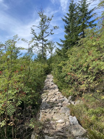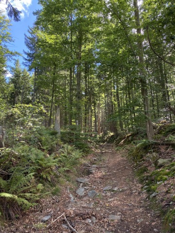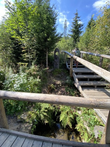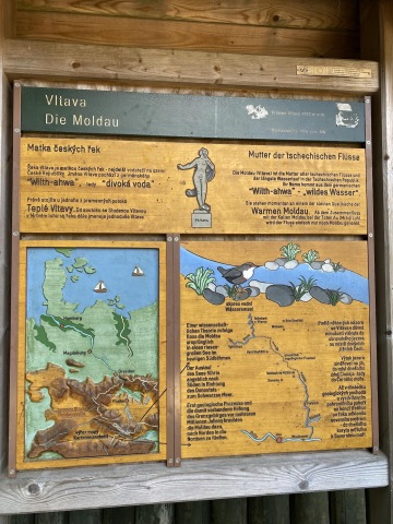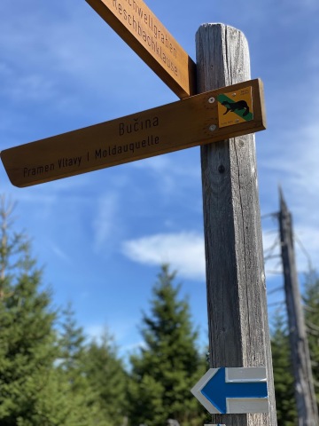 Jdeme kousek po silnici už na německé straně a zabočujeme do lesa. Mýtinu střídá neobvyklá kamenitá cesta. Radujeme se, že jsme předběhli všechny výpravy, načež zjišťujeme, že jsme zapomněli zahnout a jdeme špatnou cestou zpátky do Německa. Vracíme se kousek zpět a stoupáme po kamenitých schodech kolem nejvyššího vrcholu druhého dne, Siebensteinkopf k pramenu Vltavy. Zde se dle očekávání shromažďuje více turistů, ale oproti Krkonoším je to tu příjemně prázdné.