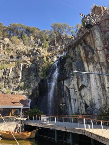 Přijíždíme ke komplexu, který jako by vypadl z filmu o pirátech. Hezké koloniální domky lemující umělé jezero s plachetnicí uprostřed. Park je obklopen skalami, ze kterých stéká vysoký vodopád a nad ním se line dlouhá dráha lanových mostů zakončena možností skoku z 20 m výšky nebo sjezdem zavěšen na laně. Tady se dá vyblbnout.